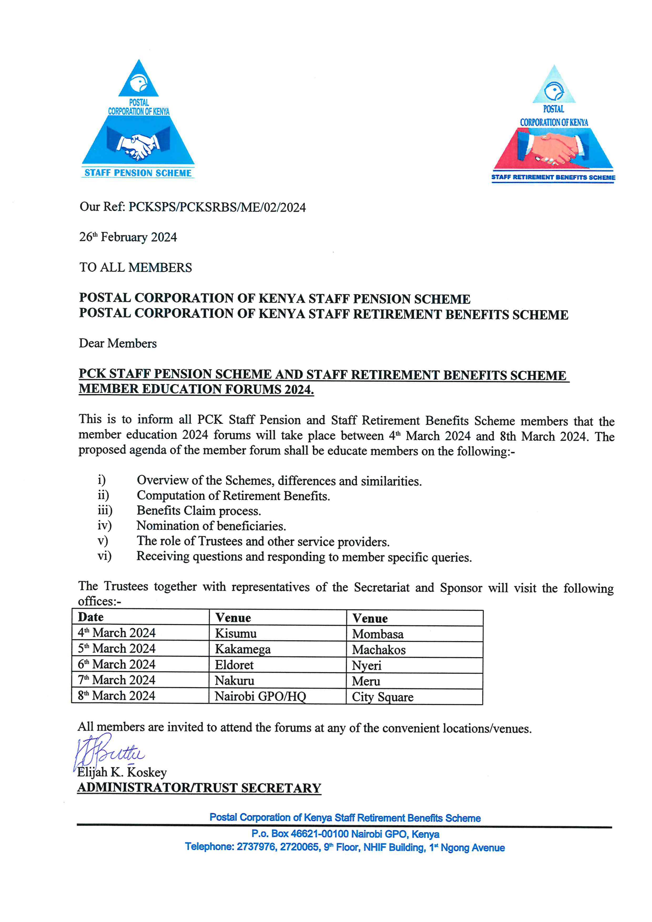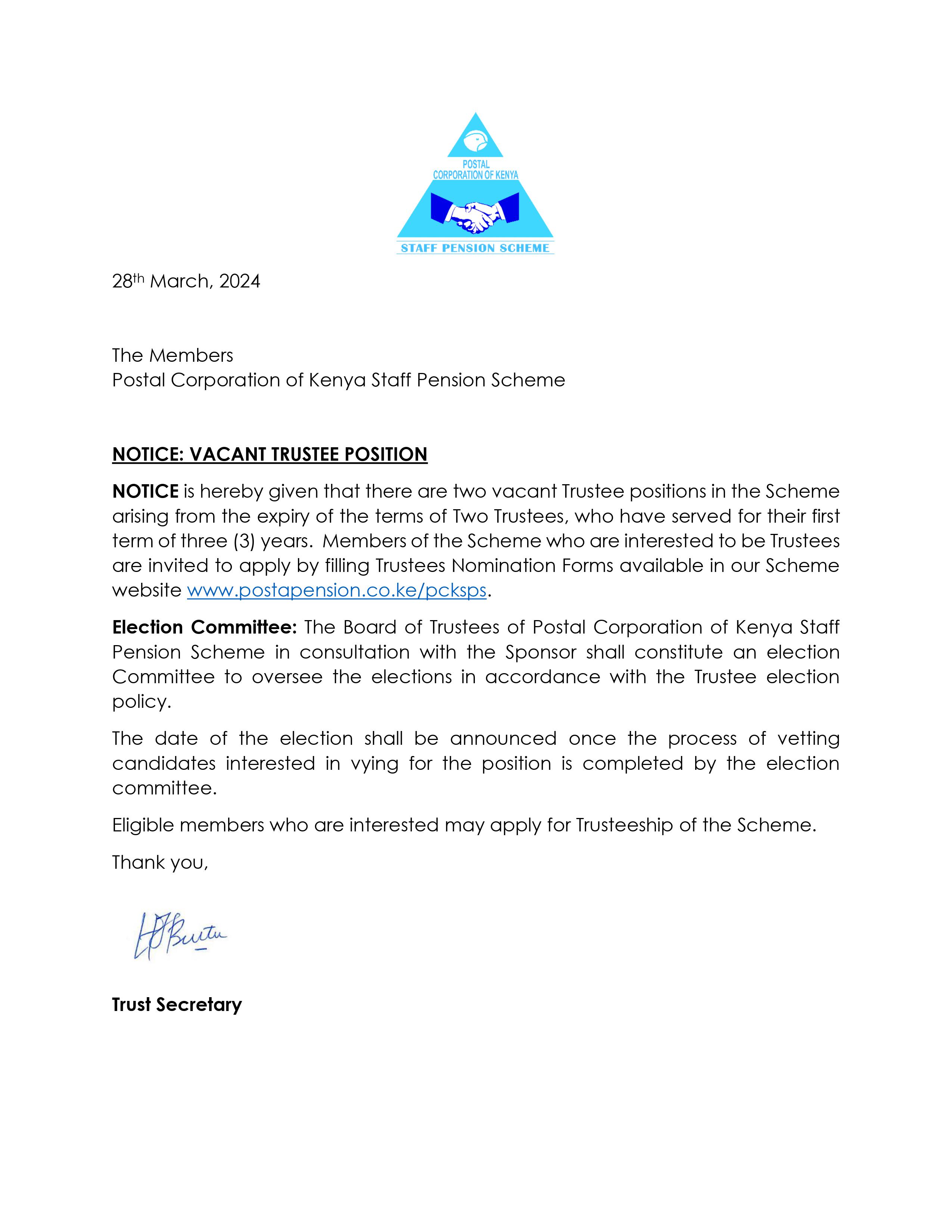 POSTAL CORPORATION OF KENYA STAFF PENSION SCHEME CANDIDATES WHO SUBMITTED NOMINATION PAPERS FOR THE POSITION OF TRUSTEE
